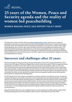 2025 marks the 25th anniversary of UN Security Council Resolution 1325 and the creation of the Women, Peace and Security (WPS) agenda. The Women Waging Peace network, which was created in 1999, has supported women peacebuilders around the world as they work to create more peaceful and equitable societies over the same time. The members of the network are implementing Women, Peace and Security priorities in their communities, advocating for gender equality and gender-responsive solutions to violence. This report shows the reality of their work: even after 25 years of the WPS agenda, they feel frustrated with formal WPS policies and programming, they consistently face threats to their safety and they believe that ensuring gender equality and preventing gender-based violence are fundamental to building peace.