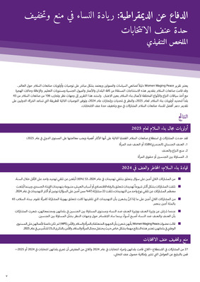 ر ويعتمد بشكل مبارش عىل توصيات وأولويات صانعات السالم حول العالم. ً � لصانعي السياسات والممولني ر يعترب تقرير Peace Waging Women دليًال أعمار والميول الجنسية ومستويات التعليم وا إإلعاقة وحاالت الهجرة وقد قامت صانعات السالم بتقديم هذه االستنتاجات المستقاة من كافة البلدان واأل ن االعتبار. واستند هذا التقرير إىل وجهات نظر وتجارب 106 من صانعات السالم من 43 أ � عمال بناء السالم بعني أنواع المختلفة أل مع أخذ سياقات ال زنزاع واأل ن عىل ي ر تساعد الرش � كاء الدوليني بلدًاً لتحديد أولويات بناء السالم لعام ،2025 والنظر يفي تحديات وإنجازات عام ،2024 وتوفرير � التوصيات التالية للطريقة اليت تقديم دعم أفضل للنساء صانعات السالم المشاركات يفي منع وتخفيف حدة عنف االنتخابات.