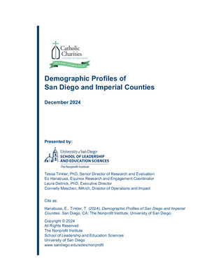 The Demographic Profiles of San Diego and Imperial Counties provides a snapshot of the two counties' vulnerable populations, including low-income communities, youth, immigrants, refugees, individuals experiencing homelessness, and retirement-age adults. While these counties differ in population size by more than an order of magnitude, the backdrop of California's rising cost of living, shifting immigration policies, income and health disparities, and the projections for an increasing aging population present compounding barriers to financial stability and access to services for all ages. Comprehensive data to understand these community needs was more readily available for San Diego County than Imperial County. This report was prepared for Catholic Charities Diocese of San Diego by The Nonprofit Institute.